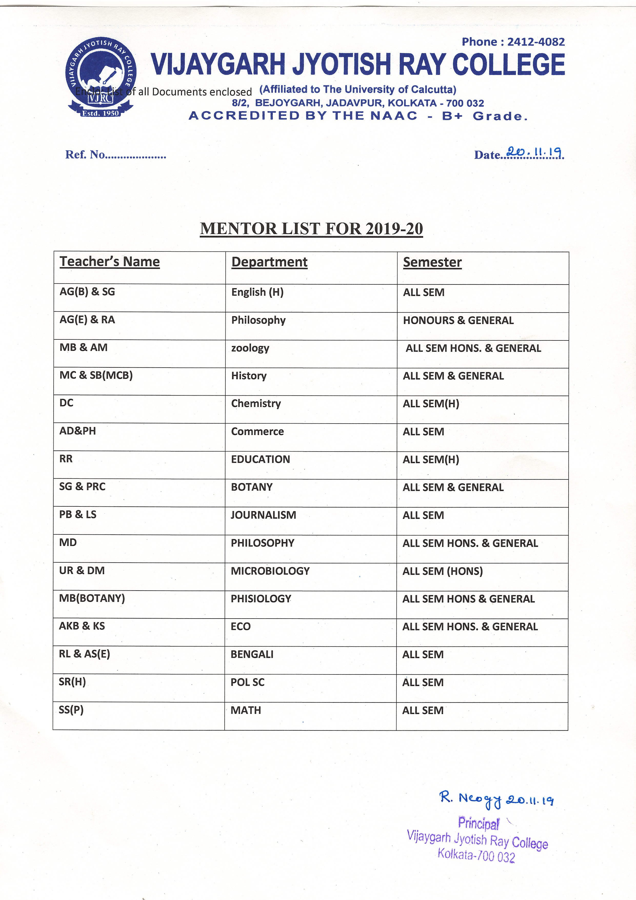 Dr Rajyashri Neogy(Principal) or Prof Mainak Saibya (Convenor, Anti Ragging Committee)