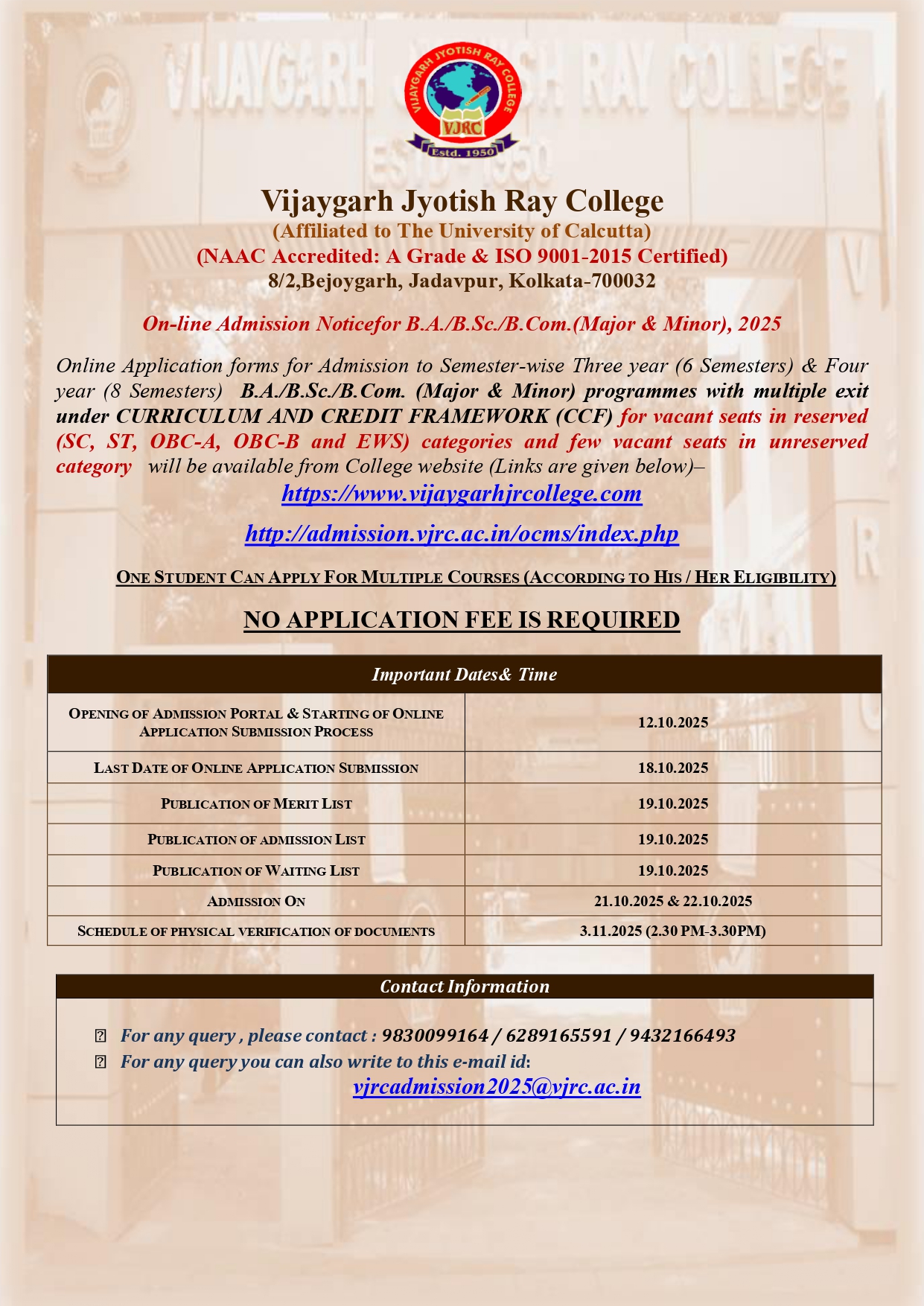 For more than six decades Vijaygarh Jyotish Ray College travelled to achieve academic excellence with social justice by crossing several hurdles. Our vision, mission and objective is to provide quality education to all irrespective of caste, creed, religion and economic condition. We are sincerely trying to make our students competent, self-sufficient, matured, skilled and responsible citizen of future India....